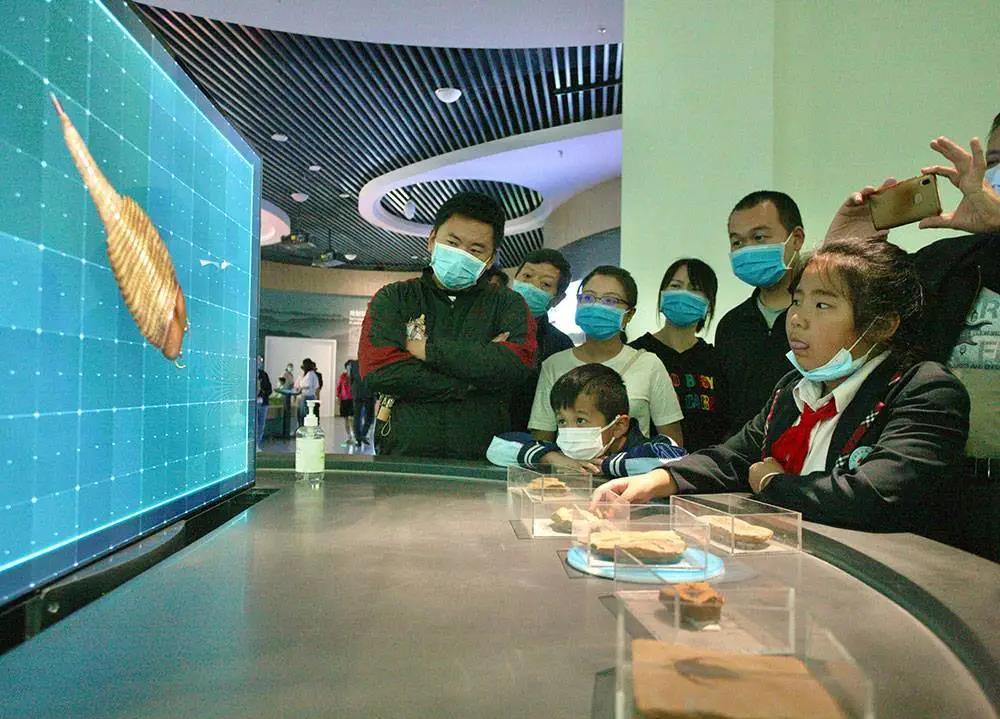 在展陳上,該館使用低反射玻璃展柜、恒溫恒濕系統等技術設備對展品進行保護,同時采用前沿科技,如柔性屏、透明屏、高清LED球型屏、VR、智能體感互動等手段,配合200多個多媒體視頻,展示了寒武紀生命大爆發的生動場景,以及地球生命演化的壯麗和神奇,為參觀者提供了有趣的視覺體驗,激發參觀者思考人類將走向何方。